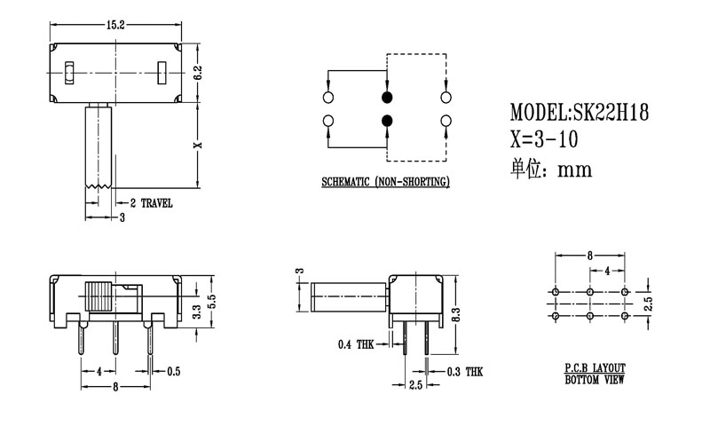 使用功率/額定值Rating:DC 50V 0.3A~1A 觸點電阻/Contact Resistance:< 100 mΩ 絕緣電阻/Insulation Resistance:≥ 100 MΩ 耐壓/Withstand Voltage:500V AC for 1 minute 使用壽命/Life cycles:10000次 操作溫度/Operationg Temperature:-16℃to+60℃ 儲存溫度/Storage Temperature:-40℃to+85℃ 符合標準/Complies with:RoHs&Reach
