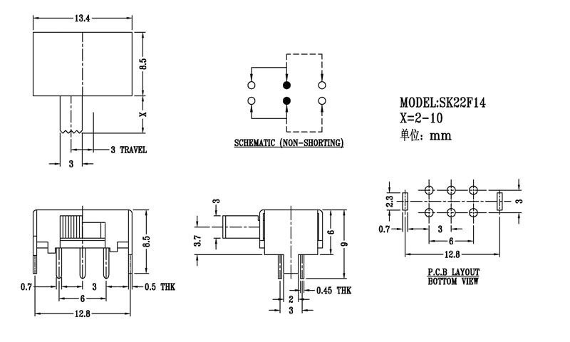 Slide Switch Main data Rating:DC 50V 0.3A~1A ContactResistance:< 100 mΩ InsulationResistance:≥ 100 MΩ Withstand Voltage:500V AC for 1 minute Operating Force:180~500gf Life cycles:10000次 Operationg Temperature:-16℃to+60℃ Storage Temperature:-40℃to+85℃ Complies with:RoHs&Reach