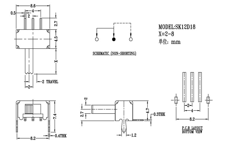 Slide Switch Main data Rating:DC 50V 0.3A~1A ContactResistance:< 100 mΩ InsulationResistance:≥ 100 MΩ Withstand Voltage:500V AC for 1 minute Operating Force:180~500gf Life cycles:10000次 Operationg Temperature:-16℃to+60℃ Storage Temperature:-40℃to+85℃ Complies with:RoHs&Reach