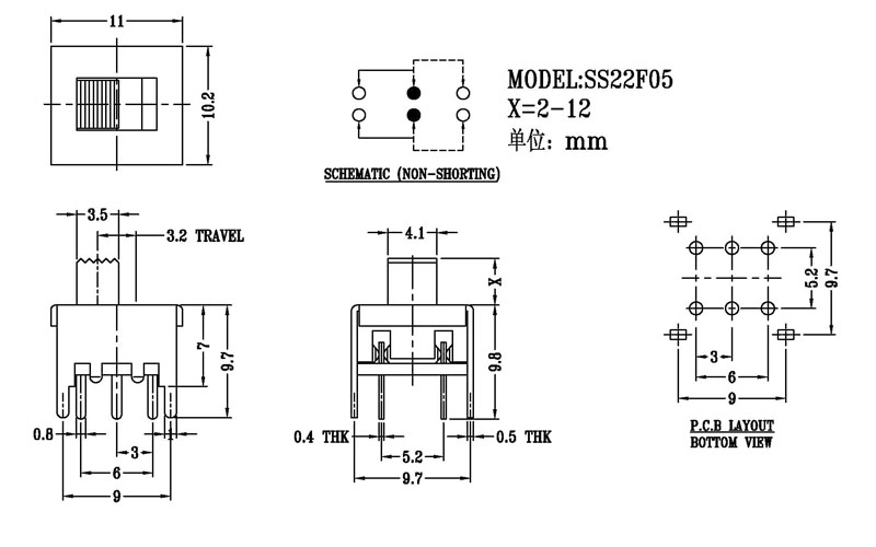Slide Switch Main data Rating:DC 50V 0.3A~1A ContactResistance:< 100 mΩ InsulationResistance:≥ 100 MΩ Withstand Voltage:500V AC for 1 minute Operating Force:180~500gf Life cycles:10000次 Operationg Temperature:-16℃to+60℃ Storage Temperature:-40℃to+85℃ Complies with:RoHs&Reach