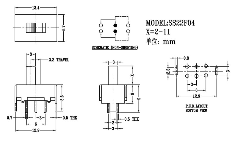 Slide Switch Main data Rating:DC 50V 0.3A~1A ContactResistance:< 100 mΩ InsulationResistance:≥ 100 MΩ Withstand Voltage:500V AC for 1 minute Operating Force:180~500gf Life cycles:10000次 Operationg Temperature:-16℃to+60℃ Storage Temperature:-40℃to+85℃ Complies with:RoHs&Reach