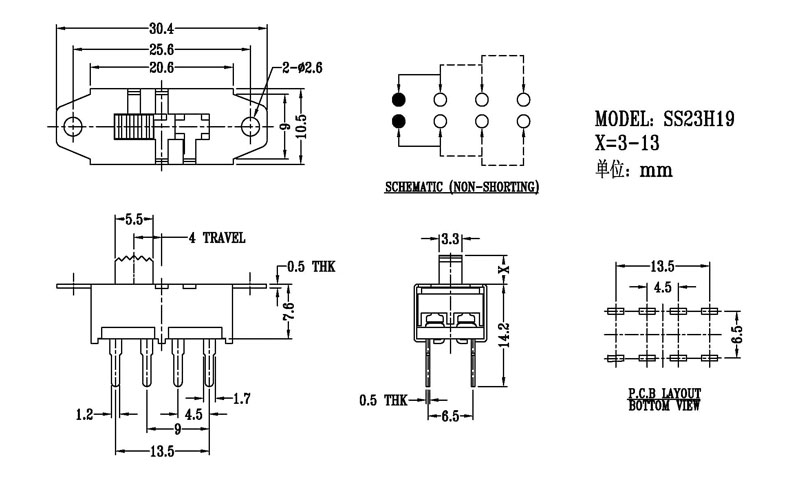 Slide Switch Main data Rating:DC 50V 0.3A~1A ContactResistance:< 100 mΩ InsulationResistance:≥ 100 MΩ Withstand Voltage:500V AC for 1 minute Operating Force:180~500gf Life cycles:10000次 Operationg Temperature:-16℃to+60℃ Storage Temperature:-40℃to+85℃ Complies with:RoHs&Reach