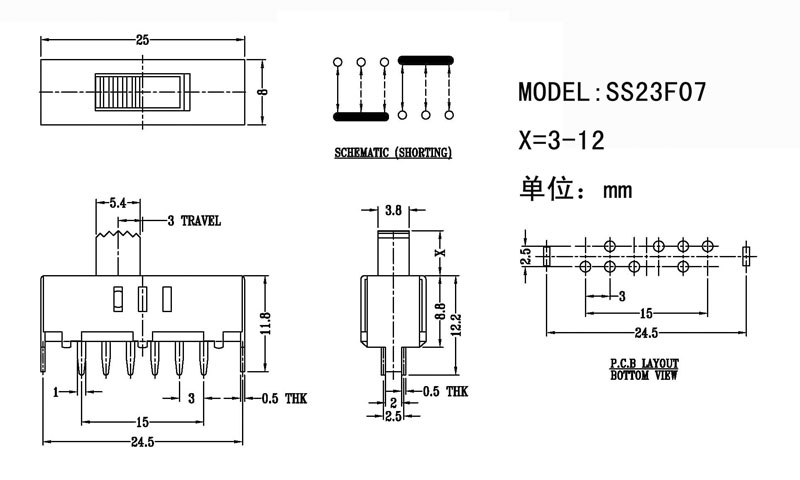 Slide Switch Main data Rating:DC 50V 0.3A~1A ContactResistance:< 100 mΩ InsulationResistance:≥ 100 MΩ Withstand Voltage:500V AC for 1 minute Operating Force:180~500gf Life cycles:10000次 Operationg Temperature:-16℃to+60℃ Storage Temperature:-40℃to+85℃ Complies with:RoHs&Reach