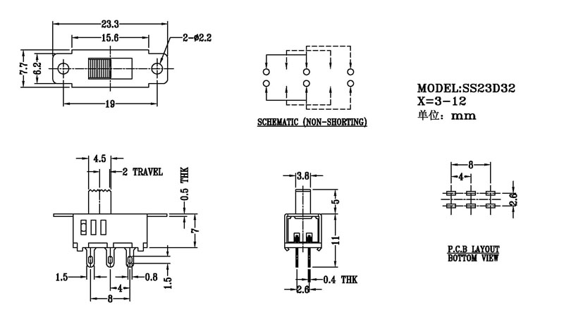 Slide Switch Main data Rating:DC 50V 0.3A~1A ContactResistance:< 100 mΩ InsulationResistance:≥ 100 MΩ Withstand Voltage:500V AC for 1 minute Operating Force:180~500gf Life cycles:10000次 Operationg Temperature:-16℃to+60℃ Storage Temperature:-40℃to+85℃ Complies with:RoHs&Reach