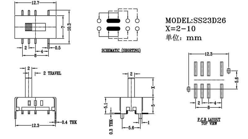 Slide Switch Main data Rating:DC 50V 0.3A~1A ContactResistance:< 100 mΩ InsulationResistance:≥ 100 MΩ Withstand Voltage:500V AC for 1 minute Operating Force:180~500gf Life cycles:10000次 Operationg Temperature:-16℃to+60℃ Storage Temperature:-40℃to+85℃ Complies with:RoHs&Reach