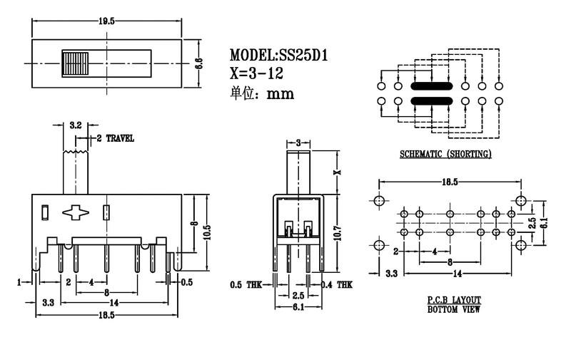 Slide Switch Main data Rating:DC 50V 0.3A~1A ContactResistance:< 100 mΩ InsulationResistance:≥ 100 MΩ Withstand Voltage:500V AC for 1 minute Operating Force:180~500gf Life cycles:10000次 Operationg Temperature:-16℃to+60℃ Storage Temperature:-40℃to+85℃ Complies with:RoHs&Reach