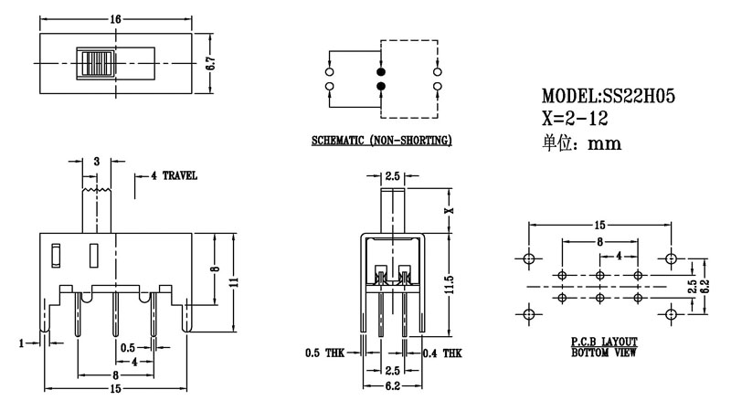 Slide Switch Main data Rating:DC 50V 0.3A~1A ContactResistance:< 100 mΩ InsulationResistance:≥ 100 MΩ Withstand Voltage:500V AC for 1 minute Operating Force:180~500gf Life cycles:10000次 Operationg Temperature:-16℃to+60℃ Storage Temperature:-40℃to+85℃ Complies with:RoHs&Reach