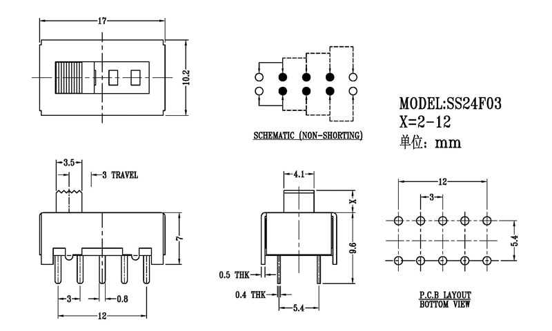 Slide Switch Main data Rating:DC 50V 0.3A~1A ContactResistance:< 100 mΩ InsulationResistance:≥ 100 MΩ Withstand Voltage:500V AC for 1 minute Operating Force:180~500gf Life cycles:10000次 Operationg Temperature:-16℃to+60℃ Storage Temperature:-40℃to+85℃ Complies with:RoHs&Reach