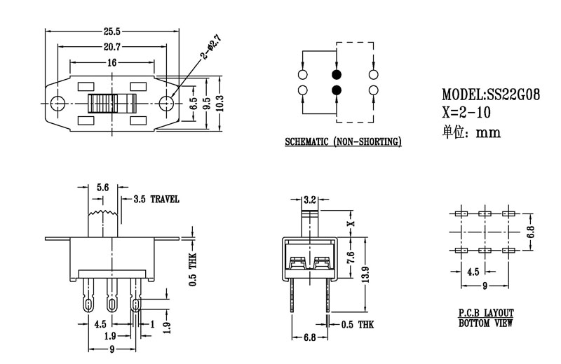 Slide Switch Main data Rating:DC 50V 0.3A~1A ContactResistance:< 100 mΩ InsulationResistance:≥ 100 MΩ Withstand Voltage:500V AC for 1 minute Operating Force:180~500gf Life cycles:10000次 Operationg Temperature:-16℃to+60℃ Storage Temperature:-40℃to+85℃ Complies with:RoHs&Reach