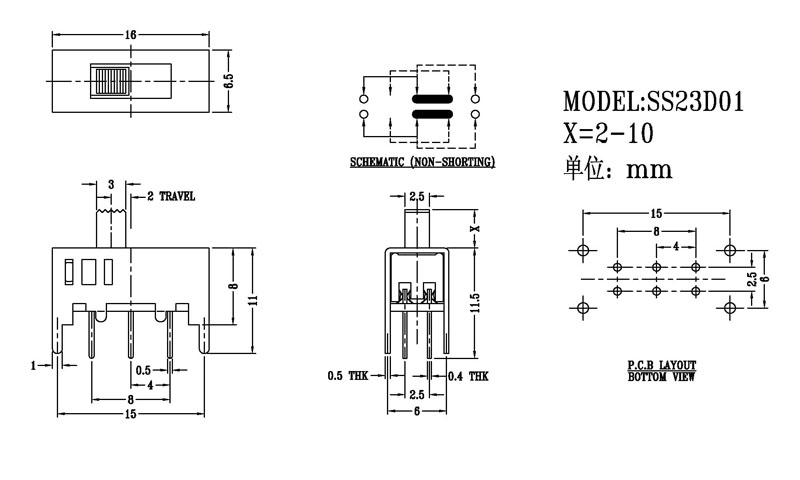 Slide Switch Main data Rating:DC 50V 0.3A~1A ContactResistance:< 100 mΩ InsulationResistance:≥ 100 MΩ Withstand Voltage:500V AC for 1 minute Operating Force:180~500gf Life cycles:10000次 Operationg Temperature:-16℃to+60℃ Storage Temperature:-40℃to+85℃ Complies with:RoHs&Reach