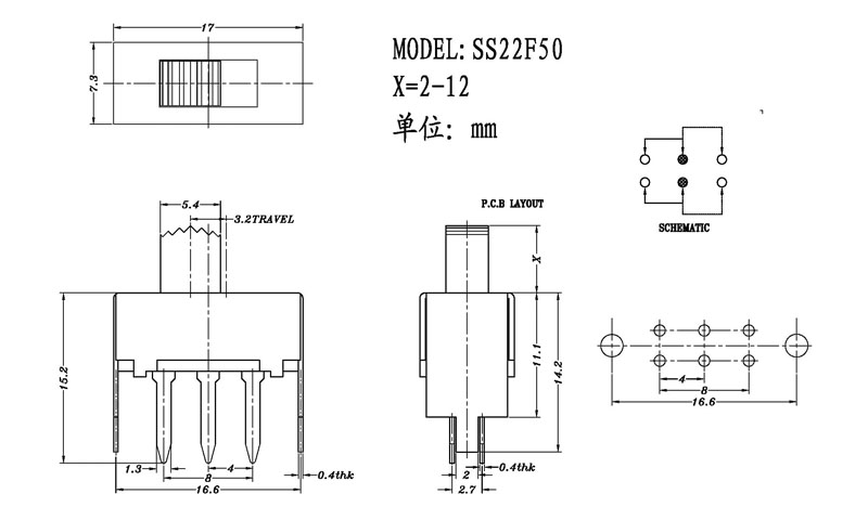 Slide Switch Main data Rating:DC 50V 0.3A~1A ContactResistance:< 100 mΩ InsulationResistance:≥ 100 MΩ Withstand Voltage:500V AC for 1 minute Operating Force:180~500gf Life cycles:10000次 Operationg Temperature:-16℃to+60℃ Storage Temperature:-40℃to+85℃ Complies with:RoHs&Reach