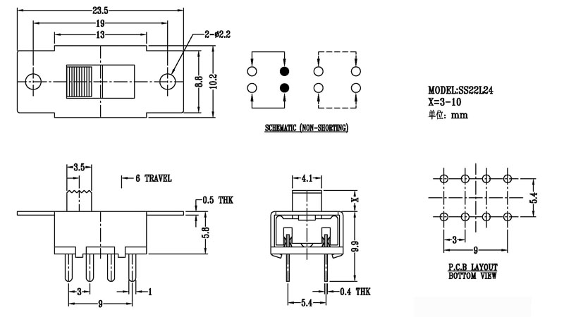 Slide Switch Main data Rating:DC 50V 0.3A~1A ContactResistance:< 100 mΩ InsulationResistance:≥ 100 MΩ Withstand Voltage:500V AC for 1 minute Operating Force:180~500gf Life cycles:10000次 Operationg Temperature:-16℃to+60℃ Storage Temperature:-40℃to+85℃ Complies with:RoHs&Reach