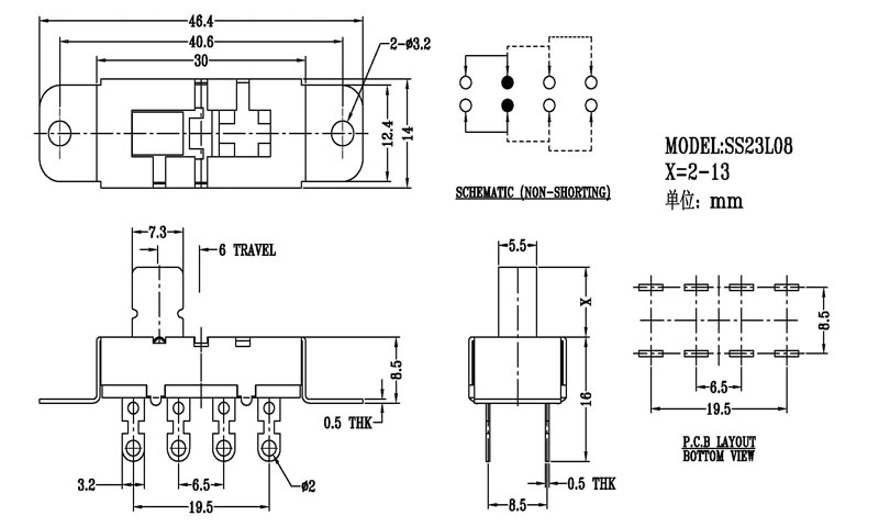 Slide Switch Main data Rating:DC 50V 0.3A~1A ContactResistance:< 100 mΩ InsulationResistance:≥ 100 MΩ Withstand Voltage:500V AC for 1 minute Operating Force:180~500gf Life cycles:10000次 Operationg Temperature:-16℃to+60℃ Storage Temperature:-40℃to+85℃ Complies with:RoHs&Reach