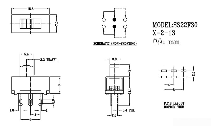 Slide Switch Main data Rating:DC 50V 0.3A~1A ContactResistance:< 100 mΩ InsulationResistance:≥ 100 MΩ Withstand Voltage:500V AC for 1 minute Operating Force:180~500gf Life cycles:10000次 Operationg Temperature:-16℃to+60℃ Storage Temperature:-40℃to+85℃ Complies with:RoHs&Reach