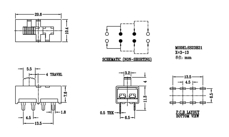 Slide Switch Main data Rating:DC 50V 0.3A~1A ContactResistance:< 100 mΩ InsulationResistance:≥ 100 MΩ Withstand Voltage:500V AC for 1 minute Operating Force:180~500gf Life cycles:10000次 Operationg Temperature:-16℃to+60℃ Storage Temperature:-40℃to+85℃ Complies with:RoHs&Reach