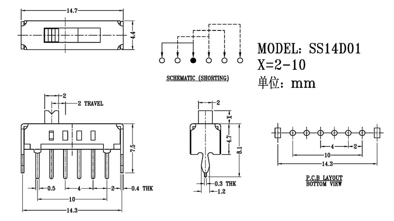 Slide Switch Main data Rating:DC 50V 0.3A~1A ContactResistance:< 100 mΩ InsulationResistance:≥ 100 MΩ Withstand Voltage:500V AC for 1 minute Operating Force:180~500gf Life cycles:10000次 Operationg Temperature:-16℃to+60℃ Storage Temperature:-40℃to+85℃ Complies with:RoHs&Reach