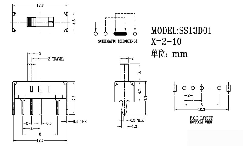 Slide Switch Main data Rating:DC 50V 0.3A~1A ContactResistance:< 100 mΩ InsulationResistance:≥ 100 MΩ Withstand Voltage:500V AC for 1 minute Operating Force:180~500gf Life cycles:10000次 Operationg Temperature:-16℃to+60℃ Storage Temperature:-40℃to+85℃ Complies with:RoHs&Reach
