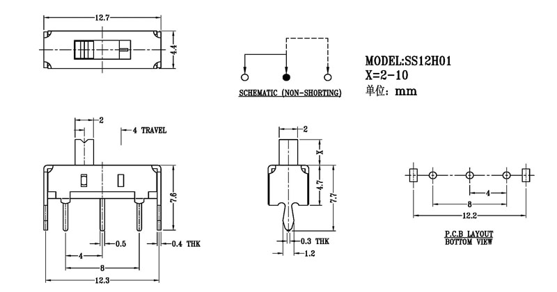 Slide Switch Main data Rating:DC 50V 0.3A~1A ContactResistance:< 100 mΩ InsulationResistance:≥ 100 MΩ Withstand Voltage:500V AC for 1 minute Operating Force:180~500gf Life cycles:10000次 Operationg Temperature:-16℃to+60℃ Storage Temperature:-40℃to+85℃ Complies with:RoHs&Reach