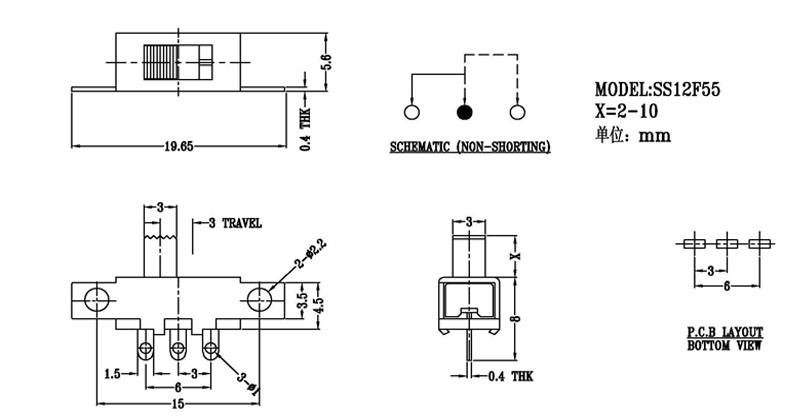 Slide Switch Main data Rating:DC 50V 0.3A~1A ContactResistance:< 100 mΩ InsulationResistance:≥ 100 MΩ Withstand Voltage:500V AC for 1 minute Operating Force:180~500gf Life cycles:10000次 Operationg Temperature:-16℃to+60℃ Storage Temperature:-40℃to+85℃ Complies with:RoHs&Reach