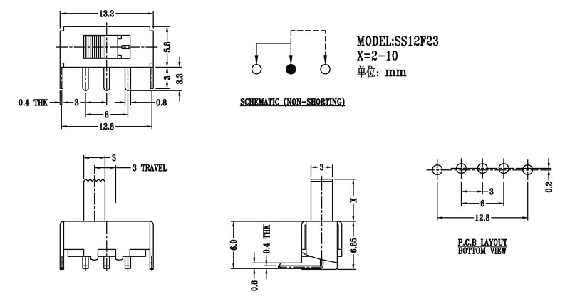 Slide Switch Main data Rating:DC 50V 0.3A~1A ContactResistance:< 100 mΩ InsulationResistance:≥ 100 MΩ Withstand Voltage:500V AC for 1 minute Operating Force:180~500gf Life cycles:10000次 Operationg Temperature:-16℃to+60℃ Storage Temperature:-40℃to+85℃ Complies with:RoHs&Reach