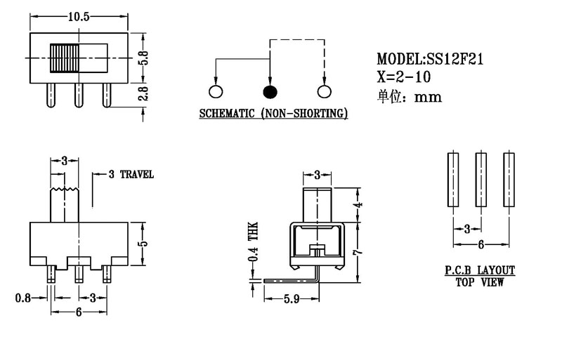 Slide Switch Main data Rating:DC 50V 0.3A~1A ContactResistance:< 100 mΩ InsulationResistance:≥ 100 MΩ Withstand Voltage:500V AC for 1 minute Operating Force:180~500gf Life cycles:10000次 Operationg Temperature:-16℃to+60℃ Storage Temperature:-40℃to+85℃ Complies with:RoHs&Reach