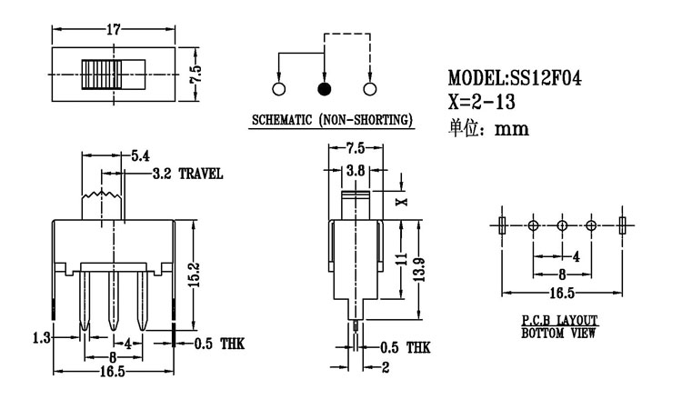 Slide Switch Main data Rating:DC 50V 0.3A~1A ContactResistance:< 100 mΩ InsulationResistance:≥ 100 MΩ Withstand Voltage:500V AC for 1 minute Operating Force:180~500gf Life cycles:10000次 Operationg Temperature:-16℃to+60℃ Storage Temperature:-40℃to+85℃ Complies with:RoHs&Reach