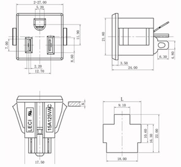 Standard: UL 498 Rating:15A 125V AC Insulation Resistance: 100MΩ 500V DC/1 minute Dielectric Strength: 2000V AC/1 minute Housing Material: Thermoplastic 94V-2~V-0