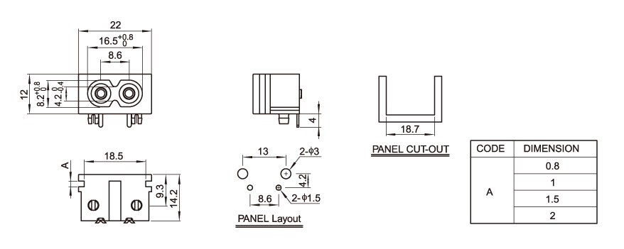 Standard: IEC 60320 C8 Rating: 2.5A 250V AC Insulation Resistance: 100MΩ 500V DC/1 minute Dielectric Strength: 2000V AC/1 minute Housing Material: Thermoplastic 94V-2~V-0