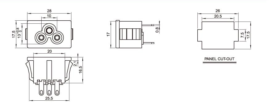 Model number:DB-6-2AS6S6 Key words: plum socket: plum socket;Adapter power socket Power adapter: laptop power supply;Medical device power supply;The charger. Or: 28 * 17.5 Current voltage: 10a 250V