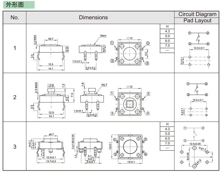 12×12 Light touch switch, light touch buttons, patch type light touch switch, pin type light touch switch, miniature light touch switch