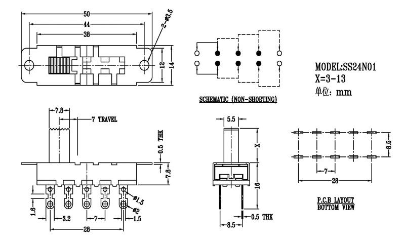 Slide Switch Main data Rating:DC 50V 0.3A~1A ContactResistance:< 100 mΩ InsulationResistance:≥ 100 MΩ Withstand Voltage:500V AC for 1 minute Operating Force:180~500gf Life cycles:10000次 Operationg Temperature:-16℃to+60℃ Storage Temperature:-40℃to+85℃ Complies with:RoHs&Reach
