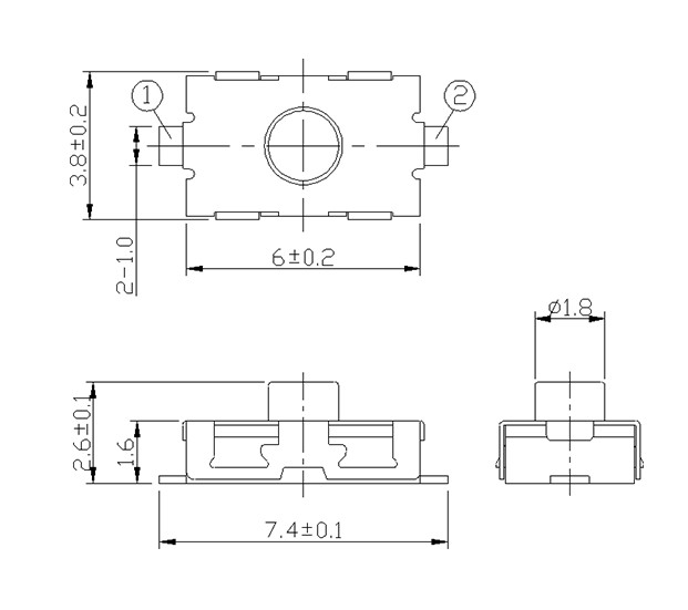 尺寸: 6.0X3.8mm 产品分类: 轻触开关 - B系列 / 3x6一型二型 应用 ※ 用于各种电子设备操作 ※ 音频设备,办公设备,通讯设备 ※ 测量仪器,电视机,电视录像机等 特点 ※ 高可靠的触点封装结构 ※ 大的按钮表面提高安装速度 ※ 回流可焊