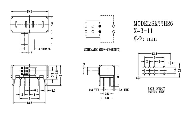 使用功率/額定值Rating:DC 50V 0.3A~1A 觸點電阻/Contact Resistance:< 100 mΩ 絕緣電阻/Insulation Resistance:≥ 100 MΩ 耐壓/Withstand Voltage:500V AC for 1 minute 使用壽命/Life cycles:10000次 操作溫度/Operationg Temperature:-16℃to+60℃ 儲存溫度/Storage Temperature:-40℃to+85℃ 符合標準/Complies with:RoHs&Reach