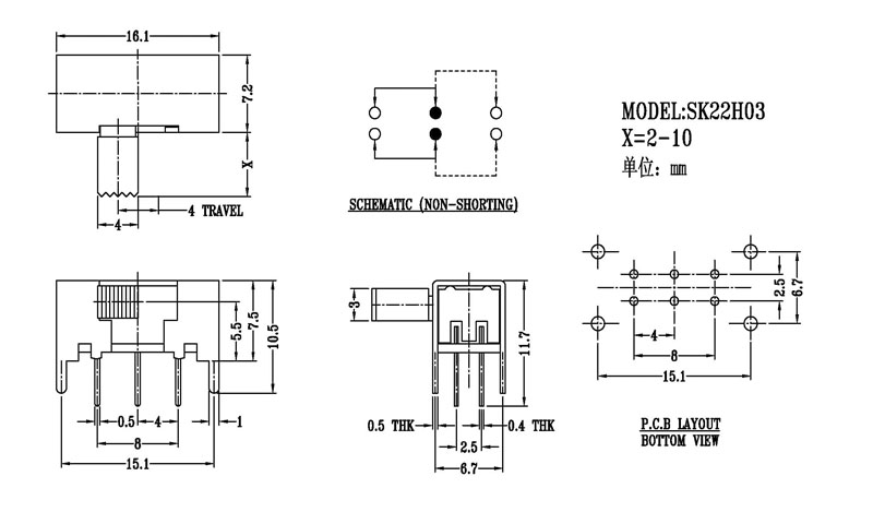撥動開關主要技術參數 使用功率/額定值:DC 50V 0.3A~1A 觸點電阻:< 100 mΩ 絕緣電阻:≥ 100 MΩ 耐壓:500V AC for 1 minute 撥動力:180~500gf 使用壽命:10000次 操作溫度:-16℃to+60℃ 儲存溫度:-40℃to+85℃ 符合標準:RoHs&Reach