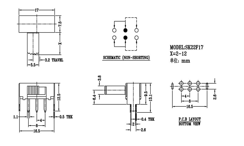 撥動開關主要技術參數 使用功率/額定值:DC 50V 0.3A~1A 觸點電阻:< 100 mΩ 絕緣電阻:≥ 100 MΩ 耐壓:500V AC for 1 minute 撥動力:180~500gf 使用壽命:10000次 操作溫度:-16℃to+60℃ 儲存溫度:-40℃to+85℃ 符合標準:RoHs&Reach