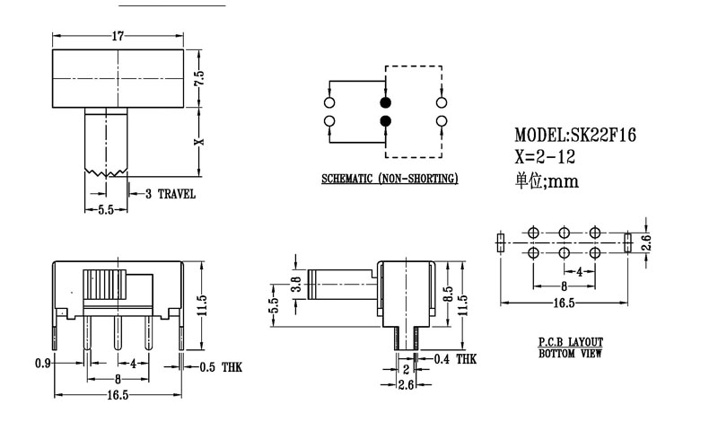 撥動開關主要技術參數: 使用功率/額定值:DC 50V 0.3A~1A 觸點電阻:< 100 mΩ 絕緣電阻:≥ 100 MΩ 耐壓:500V AC for 1 minute 撥動力:180~500gf 使用壽命:10000次 操作溫度:-16℃to+60℃ 儲存溫度:-40℃to+85℃ 符合標準:RoHs&Reach