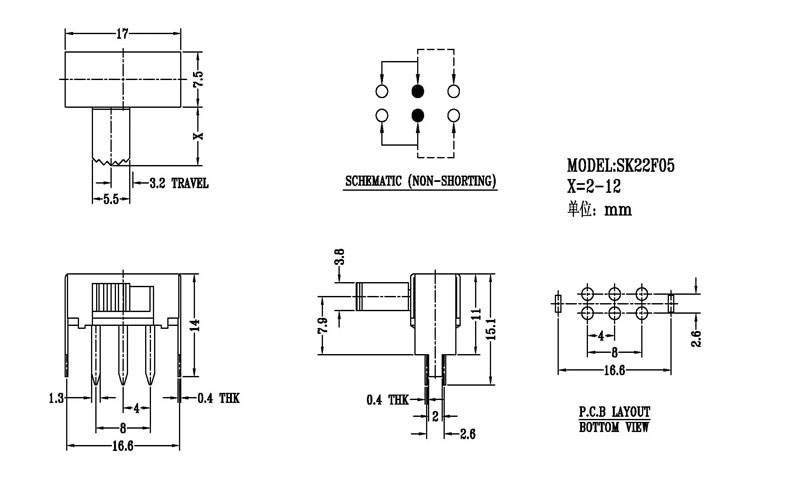 撥動開關主要技術參數: 使用功率/額定值:DC 50V 0.3A~1A 觸點電阻:< 100 mΩ 絕緣電阻:≥ 100 MΩ 耐壓:500V AC for 1 minute 撥動力:180~500gf 使用壽命:10000次 操作溫度:-16℃to+60℃ 儲存溫度:-40℃to+85℃ 符合標準:RoHs&Reach