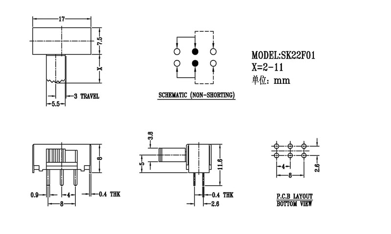 撥動開關主要技術參數: 使用功率/額定值:DC 50V 0.3A~1A 觸點電阻:< 100 mΩ 絕緣電阻:≥ 100 MΩ 耐壓:500V AC for 1 minute 撥動力:180~500gf 使用壽命:10000次 操作溫度:-16℃to+60℃ 儲存溫度:-40℃to+85℃ 符合標準:RoHs&Reach