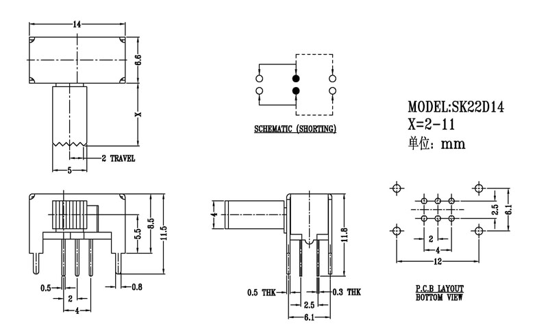 撥動開關主要技術參數: 使用功率/額定值:DC 50V 0.3A~1A 觸點電阻:< 100 mΩ 絕緣電阻:≥ 100 MΩ 耐壓:500V AC for 1 minute 撥動力:180~500gf 使用壽命:10000次 操作溫度:-16℃to+60℃ 儲存溫度:-40℃to+85℃ 符合標準:RoHs&Reach