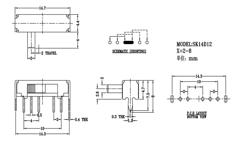撥動開關主要技術參數: 使用功率/額定值:DC 50V 0.3A~1A 觸點電阻:< 100 mΩ 絕緣電阻:≥ 100 MΩ 耐壓:500V AC for 1 minute 撥動力:180~500gf 使用壽命:10000次 操作溫度:-16℃to+60℃ 儲存溫度:-40℃to+85℃ 符合標準:RoHs&Reach