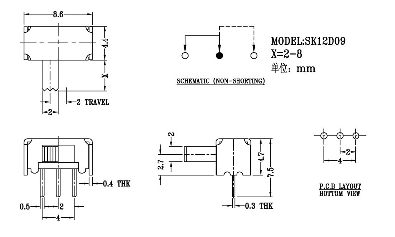 撥動開關主要技術參數: 使用功率/額定值:DC 50V 0.3A~1A 觸點電阻:< 100 mΩ 絕緣電阻:≥ 100 MΩ 耐壓:500V AC for 1 minute 撥動力:180~500gf 使用壽命:10000次 操作溫度:-16℃to+60℃ 儲存溫度:-40℃to+85℃ 符合標準:RoHs&Reach