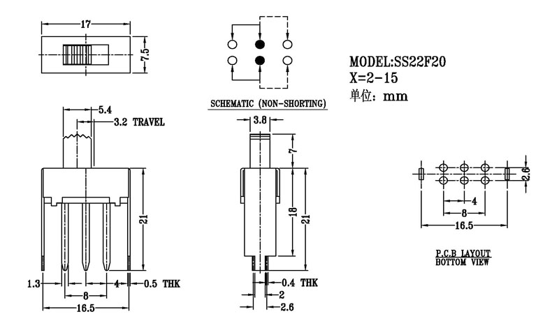 撥動開關主要技術參數: 使用功率/額定值:DC 50V 0.3A~1A 觸點電阻:< 100 mΩ 絕緣電阻:≥ 100 MΩ 耐壓:500V AC for 1 minute 撥動力:180~500gf 使用壽命:10000次 操作溫度:-16℃to+60℃ 儲存溫度:-40℃to+85℃ 符合標準:RoHs&Reach