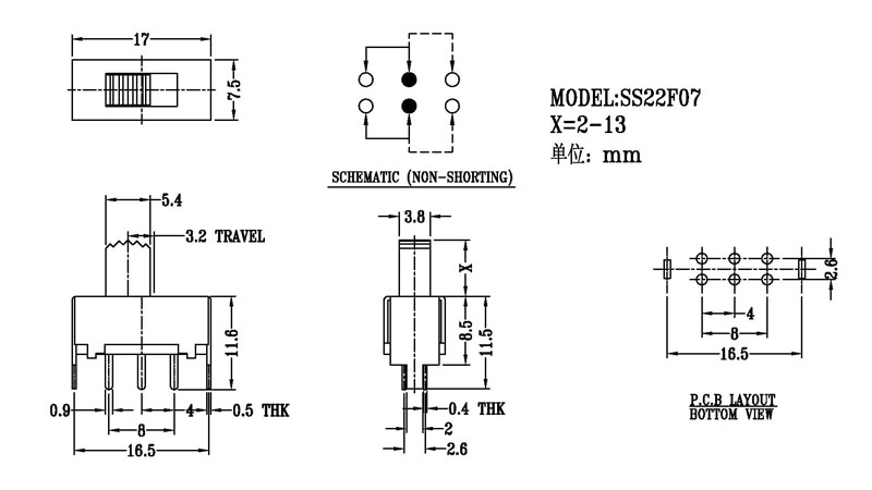 撥動開關主要技術參數: 使用功率/額定值:DC 50V 0.3A~1A 觸點電阻:< 100 mΩ 絕緣電阻:≥ 100 MΩ 耐壓:500V AC for 1 minute 撥動力:180~500gf 使用壽命:10000次 操作溫度:-16℃to+60℃ 儲存溫度:-40℃to+85℃ 符合標準:RoHs&Reach