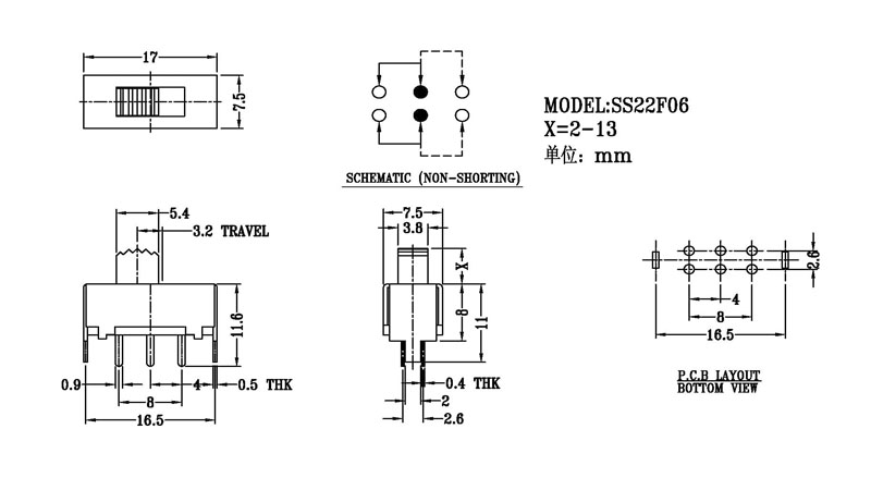 撥動開關主要技術參數: 使用功率/額定值:DC 50V 0.3A~1A 觸點電阻:< 100 mΩ 絕緣電阻:≥ 100 MΩ 耐壓:500V AC for 1 minute 撥動力:180~500gf 使用壽命:10000次 操作溫度:-16℃to+60℃ 儲存溫度:-40℃to+85℃ 符合標準:RoHs&Reach