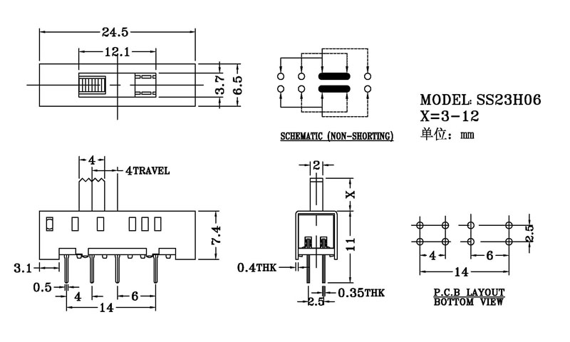 撥動開關主要技術參數: 使用功率/額定值:DC 50V 0.3A~1A 觸點電阻:< 100 mΩ 絕緣電阻:≥ 100 MΩ 耐壓:500V AC for 1 minute 撥動力:180~500gf 使用壽命:10000次 操作溫度:-16℃to+60℃ 儲存溫度:-40℃to+85℃ 符合標準:RoHs&Reach