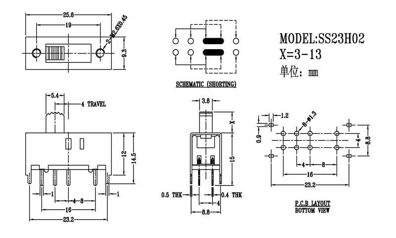 撥動開關主要技術參數: 使用功率/額定值:DC 50V 0.3A~1A 觸點電阻:< 100 mΩ 絕緣電阻:≥ 100 MΩ 耐壓:500V AC for 1 minute 撥動力:180~500gf 使用壽命:10000次 操作溫度:-16℃to+60℃ 儲存溫度:-40℃to+85℃ 符合標準:RoHs&Reach