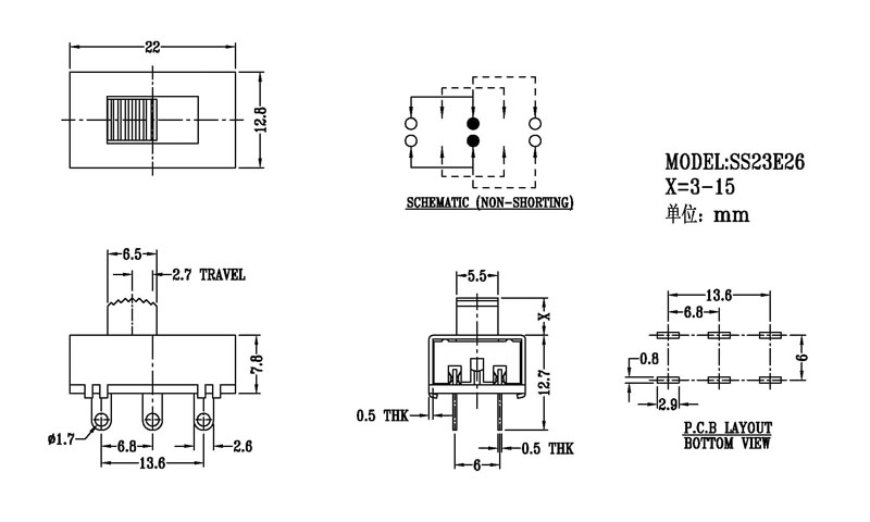 撥動開關主要技術參數 使用功率/額定值:DC 50V 0.3A~1A 觸點電阻:< 100 mΩ 絕緣電阻:≥ 100 MΩ 耐壓:500V AC for 1 minute 撥動力:180~500gf 使用壽命:10000次 操作溫度:-16℃to+60℃ 儲存溫度:-40℃to+85℃ 符合標準:RoHs&Reach
