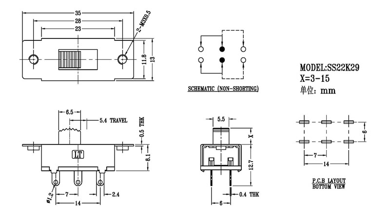 撥動開關主要技術參數: 使用功率/額定值:DC 50V 0.3A~1A 觸點電阻:< 100 mΩ 絕緣電阻:≥ 100 MΩ 耐壓:500V AC for 1 minute 撥動力:180~500gf 使用壽命:10000次 操作溫度:-16℃to+60℃ 儲存溫度:-40℃to+85℃ 符合標準:RoHs&Reach