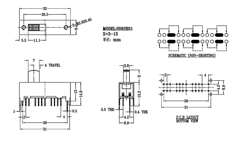 正拨拨动开关主要技術參數 使用功率/額定值:DC 50V 0.3A~1A 觸點電阻:< 100 mΩ 絕緣電阻:≥ 100 MΩ 耐壓:500V AC for 1 minute 撥動力:180~500gf 使用壽命:10000次 操作溫度:-16℃to+60℃ 儲存溫度:-40℃to+85℃ 符合標準:RoHs&Reach
