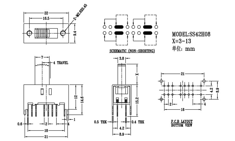 正拨拨动开关主要技術參數 使用功率/額定值:DC 50V 0.3A~1A 觸點電阻:< 100 mΩ 絕緣電阻:≥ 100 MΩ 耐壓:500V AC for 1 minute 撥動力:180~500gf 使用壽命:10000次 操作溫度:-16℃to+60℃ 儲存溫度:-40℃to+85℃ 符合標準:RoHs&Reach